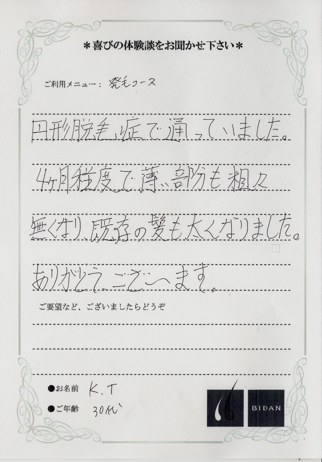 本日は明石店に通われているH様の症例変化と嬉しいお声を頂いたのでご紹介させて頂きます。